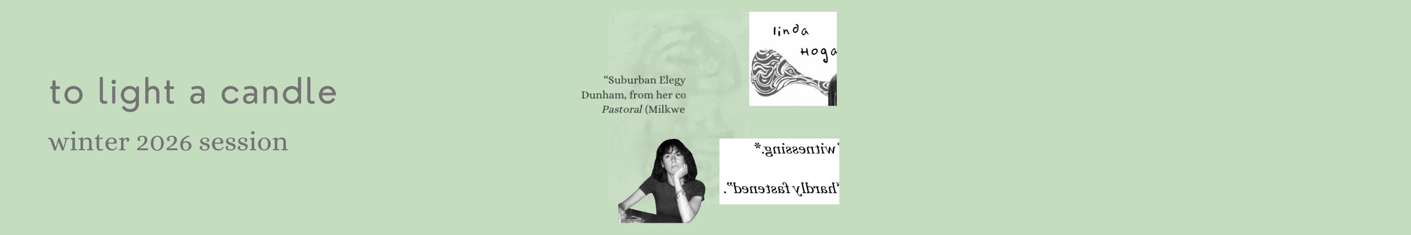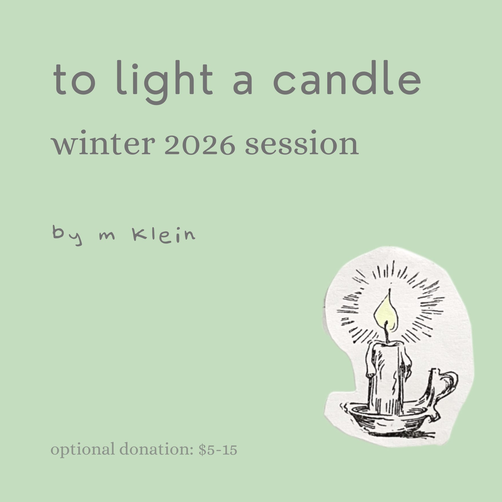 “To Light a Candle” is an asynchronous and self paced poetry workshop by mail. The Winter 2026 session includes 5 poems by 5 poets and 25 total writing prompts. This is the ninth session!
